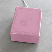 The words "TRAUTES HEIM GLÜCK ALLEIN" (home sweet home) are stiched with drilled holes onto its sides. A flower adorns the top of the machine.