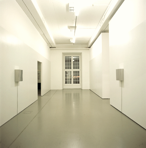 himself in the polished metal. When she/he leaves the space between the machines, they