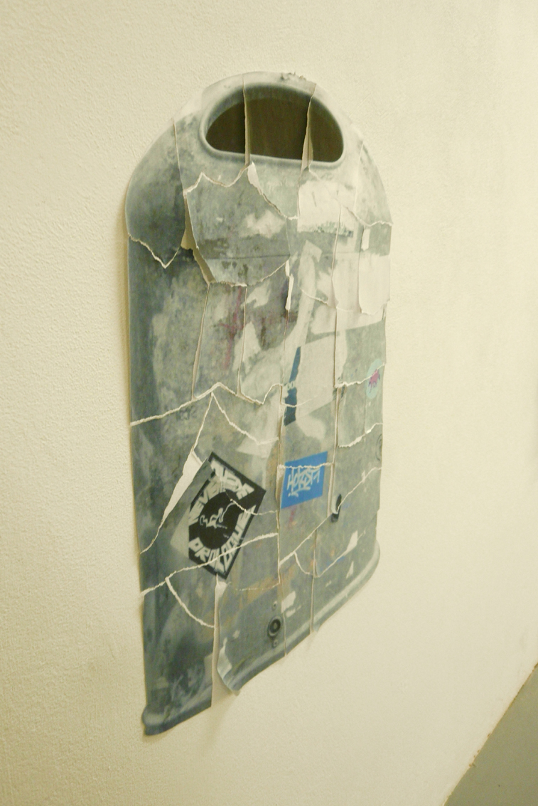 Mit Klebstoff wird er auf eine Wand geklebt. Die Höhe wähle man entsprechend der in Städten vorkommenden Mülleimerhöhe. Sein Erscheinungsbild hängt von der Exaktheit des Zusammenfügens der Einzelteile und von dem verwendeten Klebstoff ab; die Farbe ist wasserlöslich.
