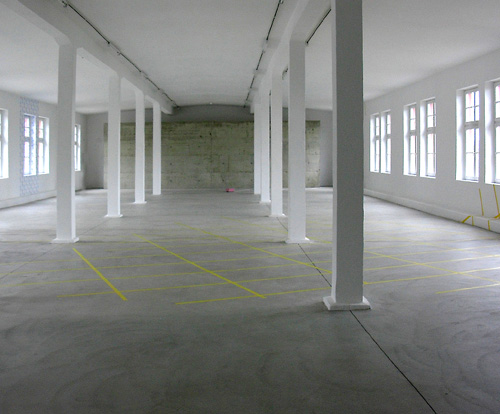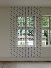 Die Arbeit NordSüdOstWest setzt sich zusammen aus einer Wand/Fensterbemalung und dem Automaten 0027. Mit unsicherer Stimme schallt das leise Rufen des Automaten durch den Raum: