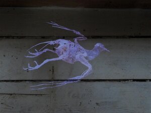 Projeziert werden ein Maulwurfshaufen, ein Fliegenfänger, eine Mausefalle, ein Käfig und ein Taubenskelett.